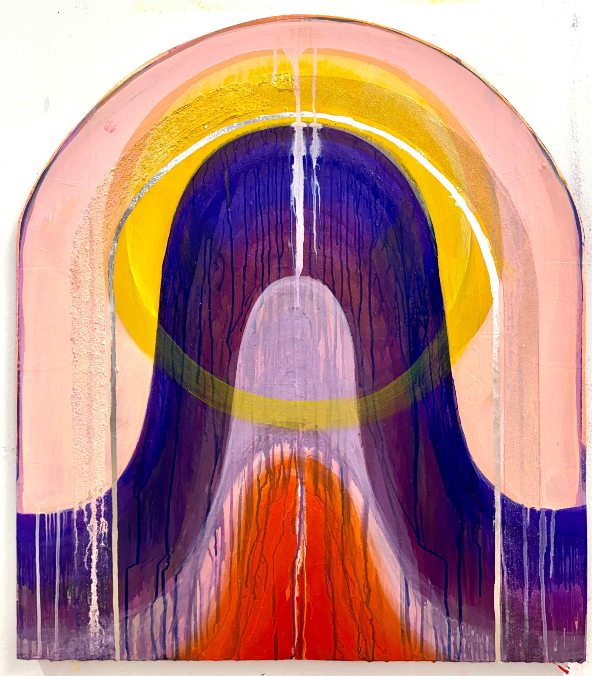 acrylic paint, glass beads, and metal foils on panel.