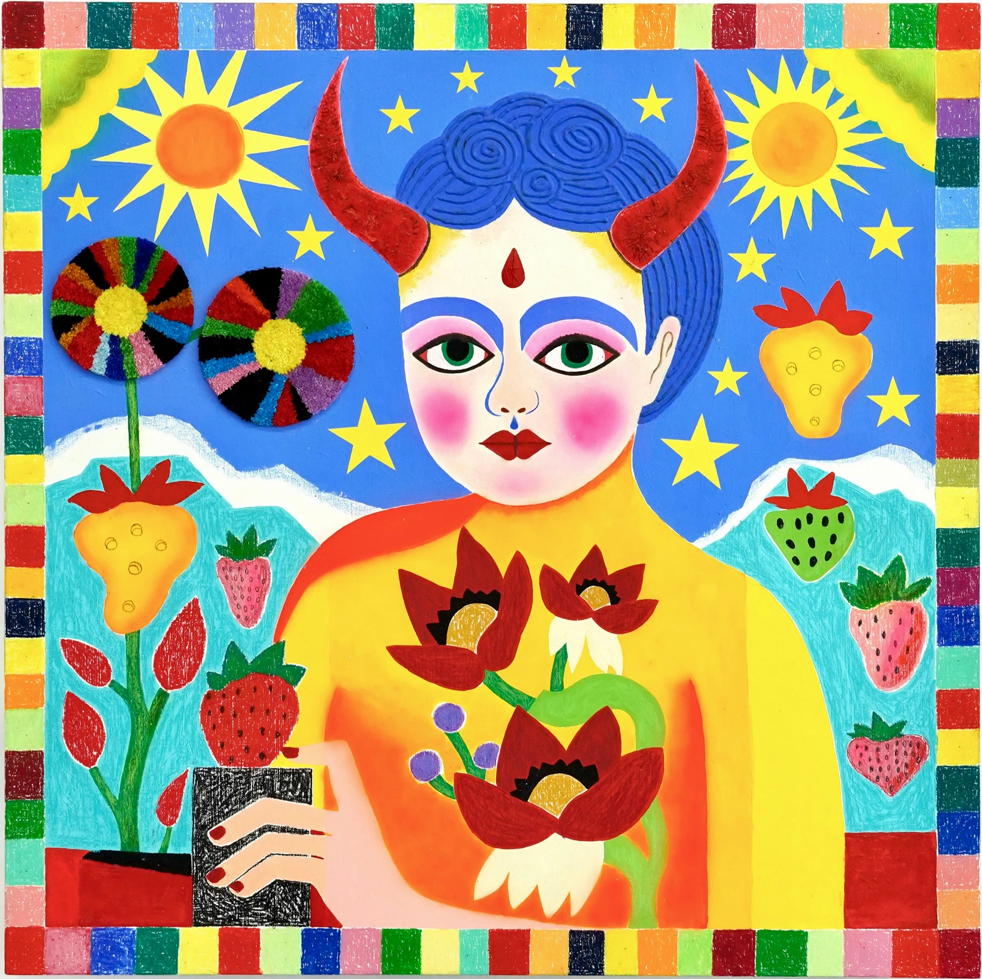 Wax pastel, acrylic, oil, needle punch, airbrush on wood panel